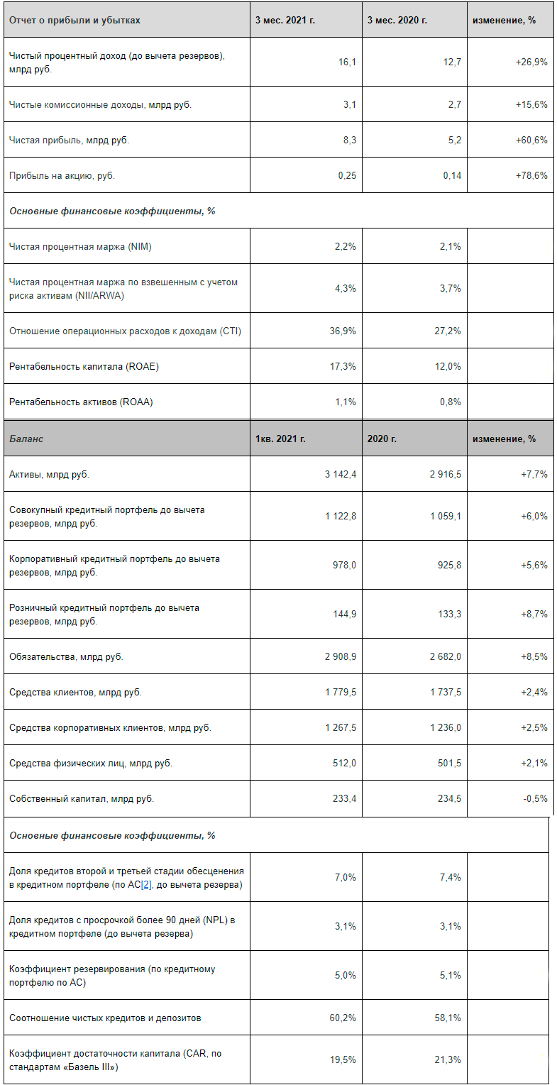 Чистая прибыль за первый квартал 2021 года увеличилась на 60,6% по сравнению с аналогичным периодом прошлого года и составила 8,3 млрд руб. Рост чистой прибыль обусловлен увеличением чистых процентных и комиссионных доходов, в основе чего лежит качественный рост бизнеса банка.