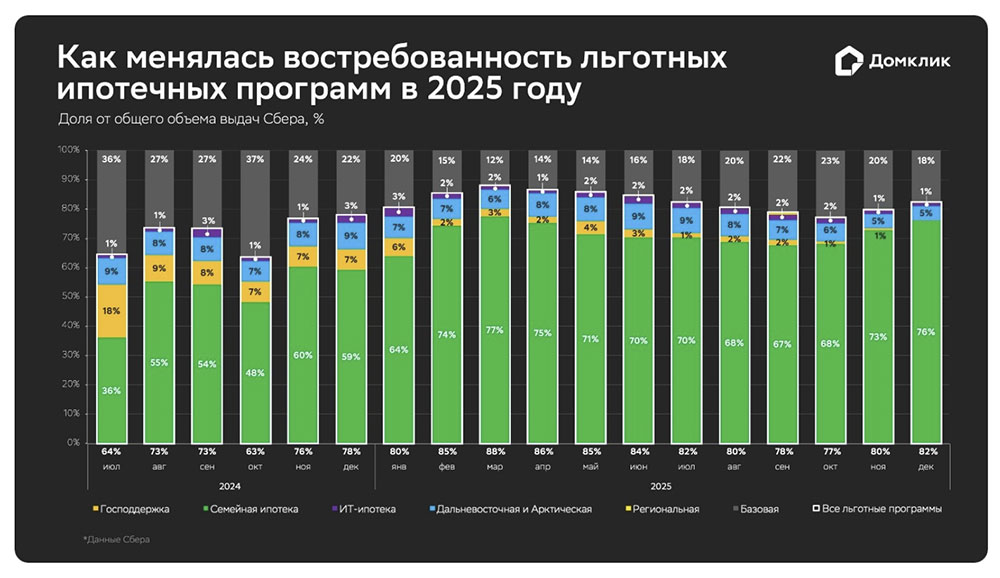 Динамика объёмов выдач по льготным программам по РФ за 2024–2025 гг. (данные Сбера). Динамика доли выдач по программе «Господдержка» показана жёлтым, по «Семейной ипотеке» — зелёным, по IT-ипотеке — фиолетовым, по «Дальневосточной и Арктической» — голубым, выдачи на общих (базовых) условиях показаны серым. Числовые значения показаны для случаев, когда значения превышают 1%. Данные по «Региональной ипотеке» по большинству месяцев не приводятся, поскольку доля выдач не превышает 1% (источник: https://www.sberbank.ru)
